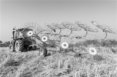 农民驾驶指轮式搂草机、圆捆机打包回收秸秆。