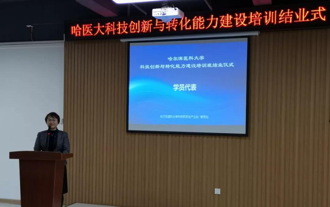 在 11 日下午的结业仪式中,哈尔滨医科大学孙长颢副校长、省知识产权局孙敬义副局长、省教育厅高教处王跃然副处长、黑龙江省生产力促进中心常国辉主任等领导参加了结业仪式。国家二级教授艾静老师作为学员代表进行发言,在高度评价授课内容和质量的同时,艾老师也直言后悔没有早点接触到 TRIZ 创新方法。随后常国辉主任为学员颁发了结业证书,孙长颢副校长进行了讲话。